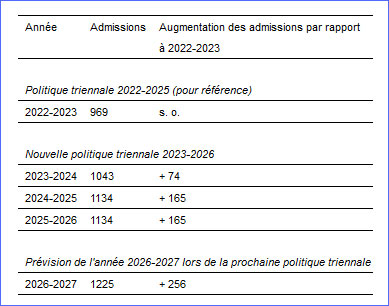 L'augmentation pour 2026-2027, qui figurera dans la prochaine politique triennale, permettra d'atteindre une augmentation totale de 660 nouvelles inscriptions sur quatre ans, par rapport à l'année 2022-2023. Des efforts considérables sont faits pour augmenter les capacités de formation de nos facultés de médecine. Une réévaluation sera amorcée dans la prochaine année afin d'augmenter le nombre d'admissions prévues en 2024-2025 et en 2025-2026 pour répondre plus rapidement à la pénurie de médecins.